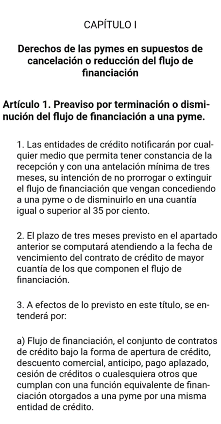 Las Entidades Financieras tendrán que notificar con un preaviso de tres meses antes del vencimiento para la no renovación o disminución de las diferentes líneas de financiación de la PYME. De esta manera, debido a la decisión unilateral de la Entidad, la empresa tenga tiempo suficiente para buscar otro proveedor financiero que le facilite financiación.